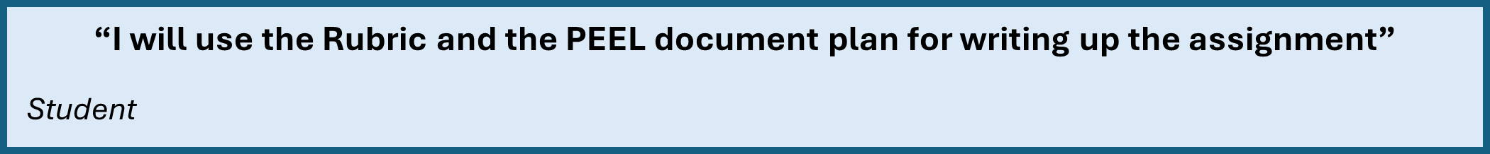 The second task involved observing learning after the rubric was embedded as a learning activity within the SC classroom. Students and the module tutor engaged in an experiential task where they discussed the key terms within the rubric, discussed what each criterion was asking, explored the differences between the grade boundaries, and collaboratively created an essay plan, using the Point, Evidence, Explain, Link (PEEL) structure for answering the assignment question at a 70%+ level.