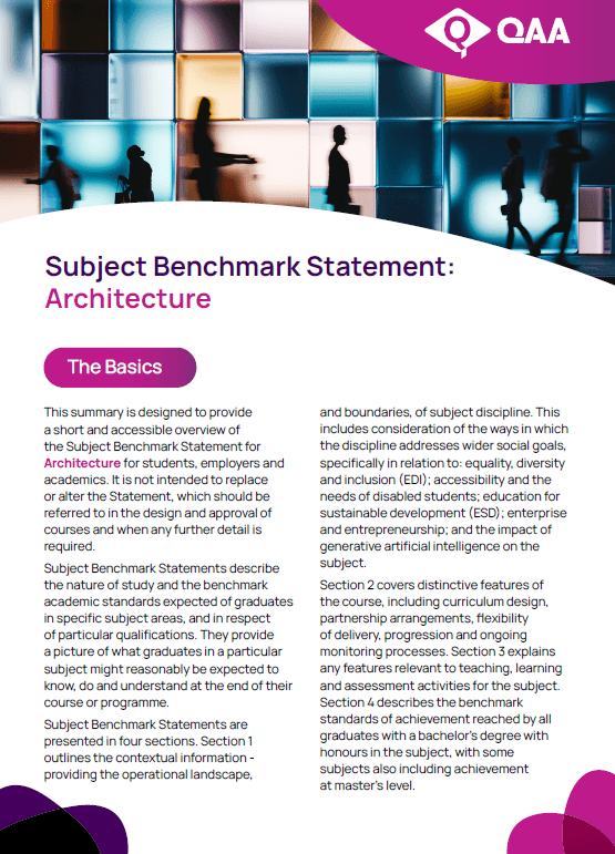 This QAA Subject Benchmark Statement for Architecture defines what can be expected of a graduate in terms of what they might know, do and understand at the end of their studies. Subject Benchmark Statements are an established part of the quality assurance arrangements in UK higher education.